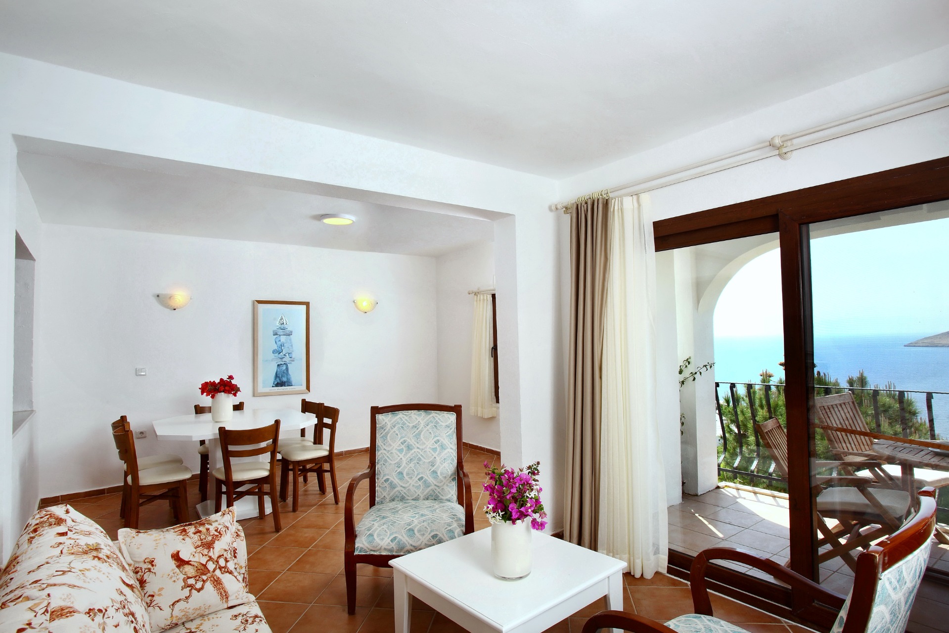 Von allen 2+1 bzw. 1+1-Zimmer Apartments hat man eine gute Aussicht auf die Bucht und Bougainvilleen in allen Farbabstufungen. Der Blick auf grüne Natur und türkisblaues Meer garantiert entspannte Ferientage.
